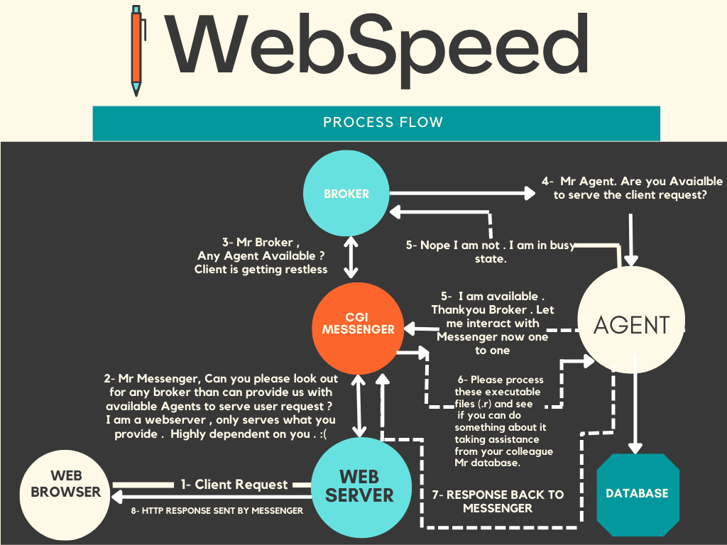 - Messenger- Its a process that runs on your WebServer such as a CGI Program . Using Messenger, client’s request/response information is exchanged between your WebServer and Application. Note: Messenger is the most crucial component of WebSpeed request/response flow .
