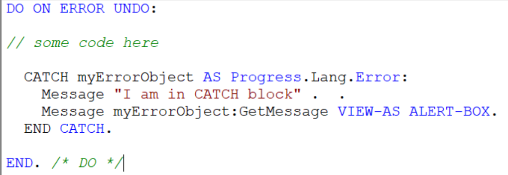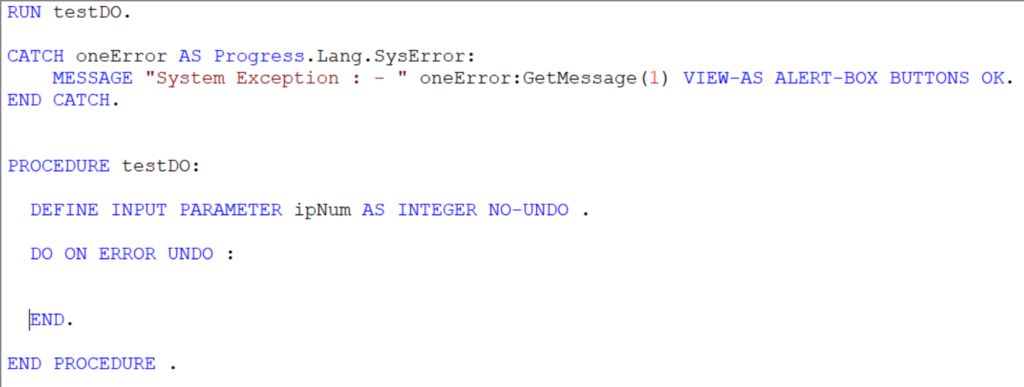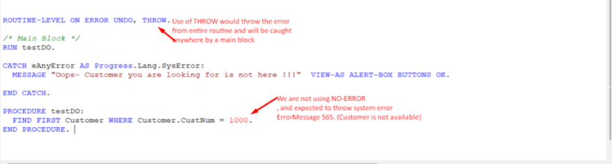 Go back to above example of NO-ERROR (where we have not used the NO-error), what do you think have happened when Progress AVM raised the error above ? Just displayed it to user and all done ???
