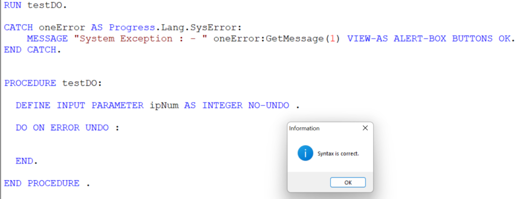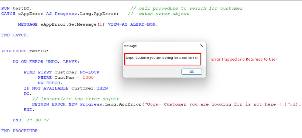 - Run time error is safely handled by our error object oneError of class Progress.Lang.SysError.